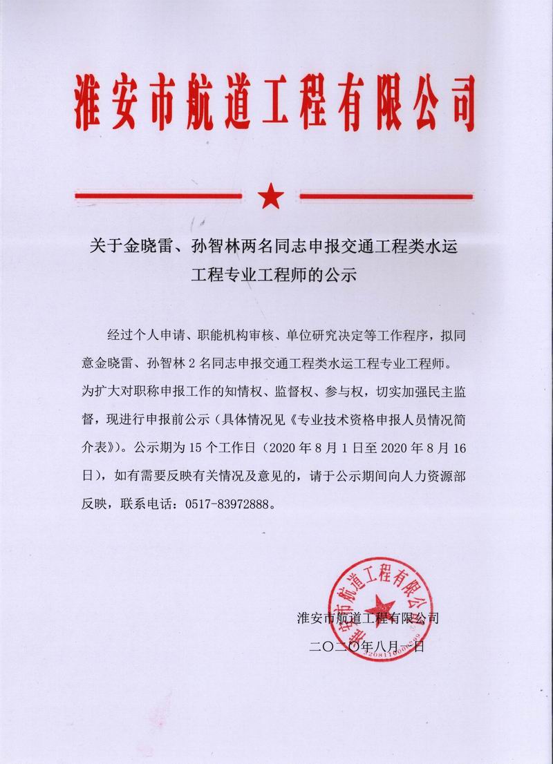 關(guān)于金曉雷、孫智林兩名同志申報交通工程類水運工程專業(yè)工程師的公示